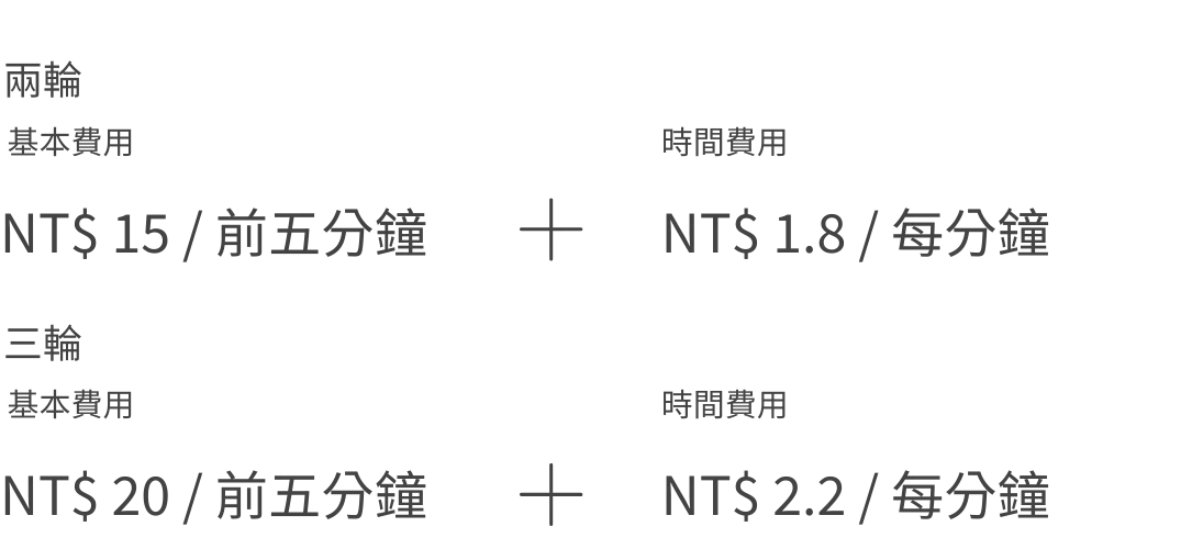 1. Usage Fees (Two-wheeled) Basic riding fee: NT15 for the first five minutes + NT1.8 per minute for time fee. (Three-wheeled) Basic riding fee: NT20 for the first five minutes + NT2.2 per minute for time fee. ※ Even if the usage time is less than one minute, it will be calculated as one minute ※ The fees may vary in some areas 【Operation-related fees】(caused by vehicle towing, theft or illegal parking) If the user’s malicious behavior or illegal parking causes the vehicle to be towed, the user must pay the losses, handling fees and usage fees incurred by us. |