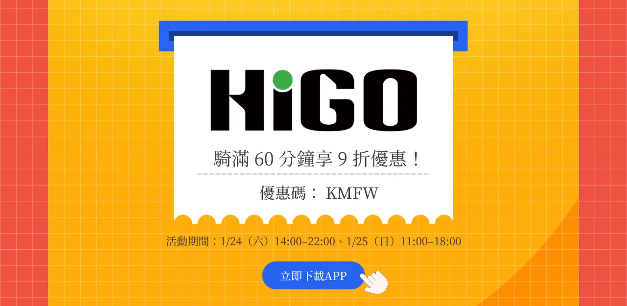 HIGO 電動滑板車串聯港都日常,輸入優惠代碼【 KMFW 】騎滿 60 分鐘享 9 折優惠!